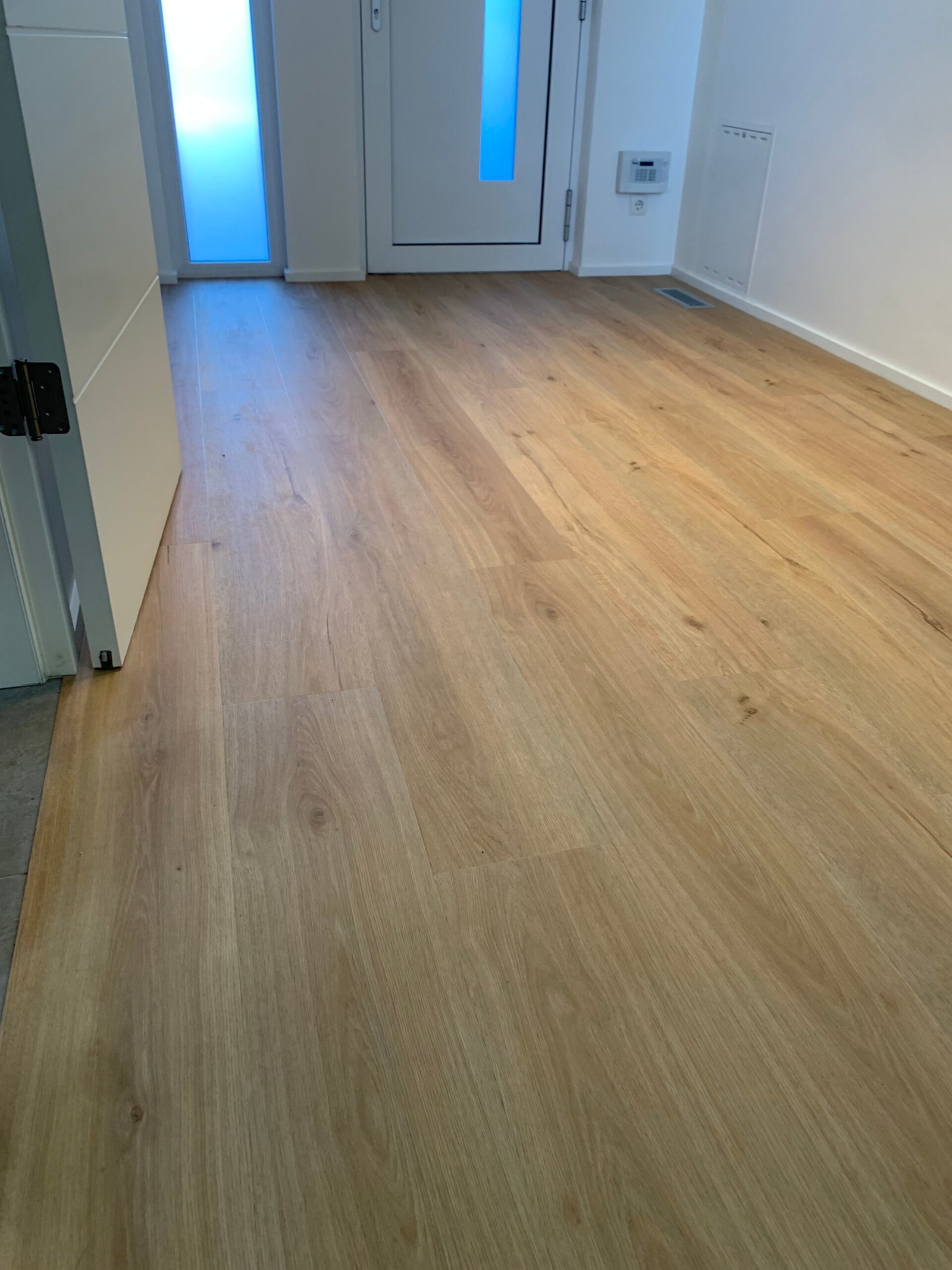 Pose de LVT collé avec profil intégré dans la marche et finitions de plinthes : Cette réalisation met en valeur un revêtement LVT soigneusement collé, avec un profil parfaitement intégré dans la marche pour une transition fluide et esthétique. Les finitions des plinthes ajoutent une touche finale élégante, assurant un résultat moderne et harmonieux.