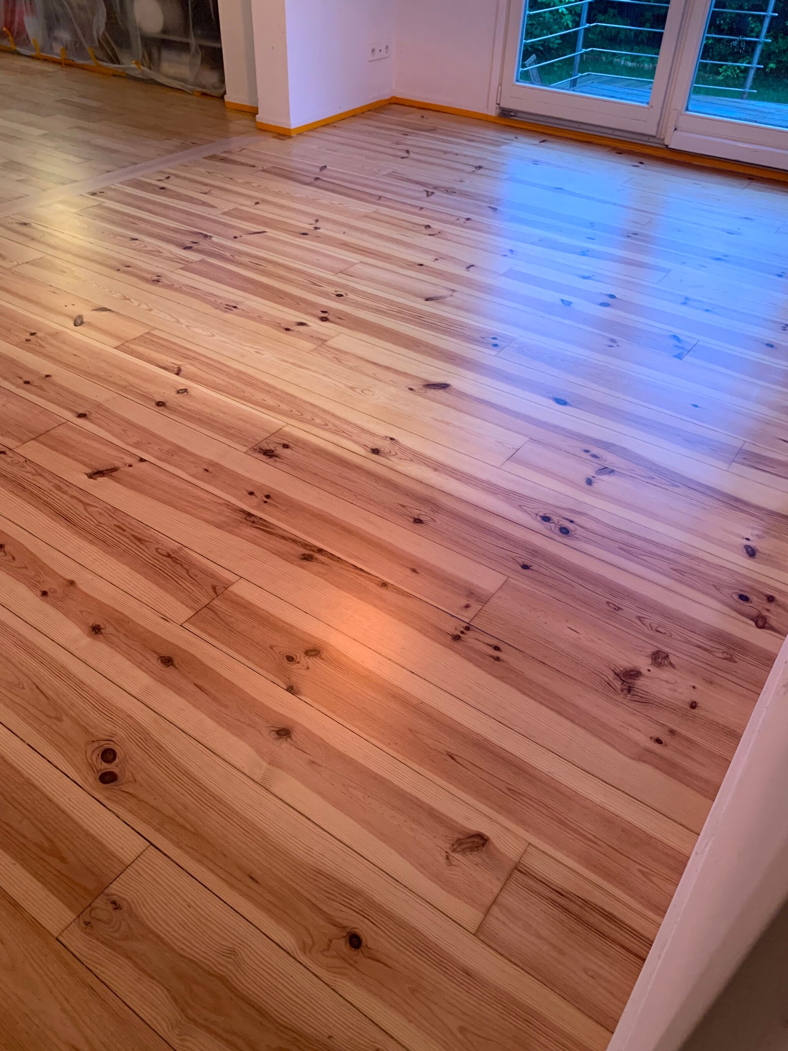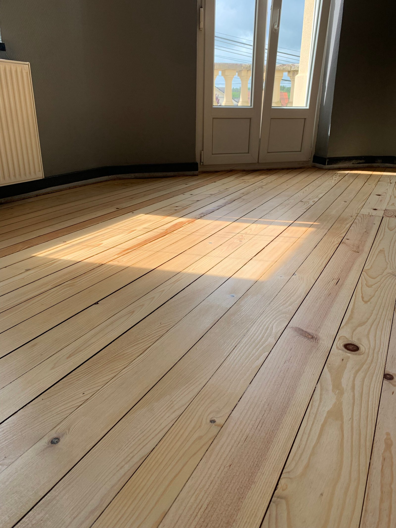 Rénovation d’un sol en mélèze avec teinte Olivebraun, finition huile-cire satinée