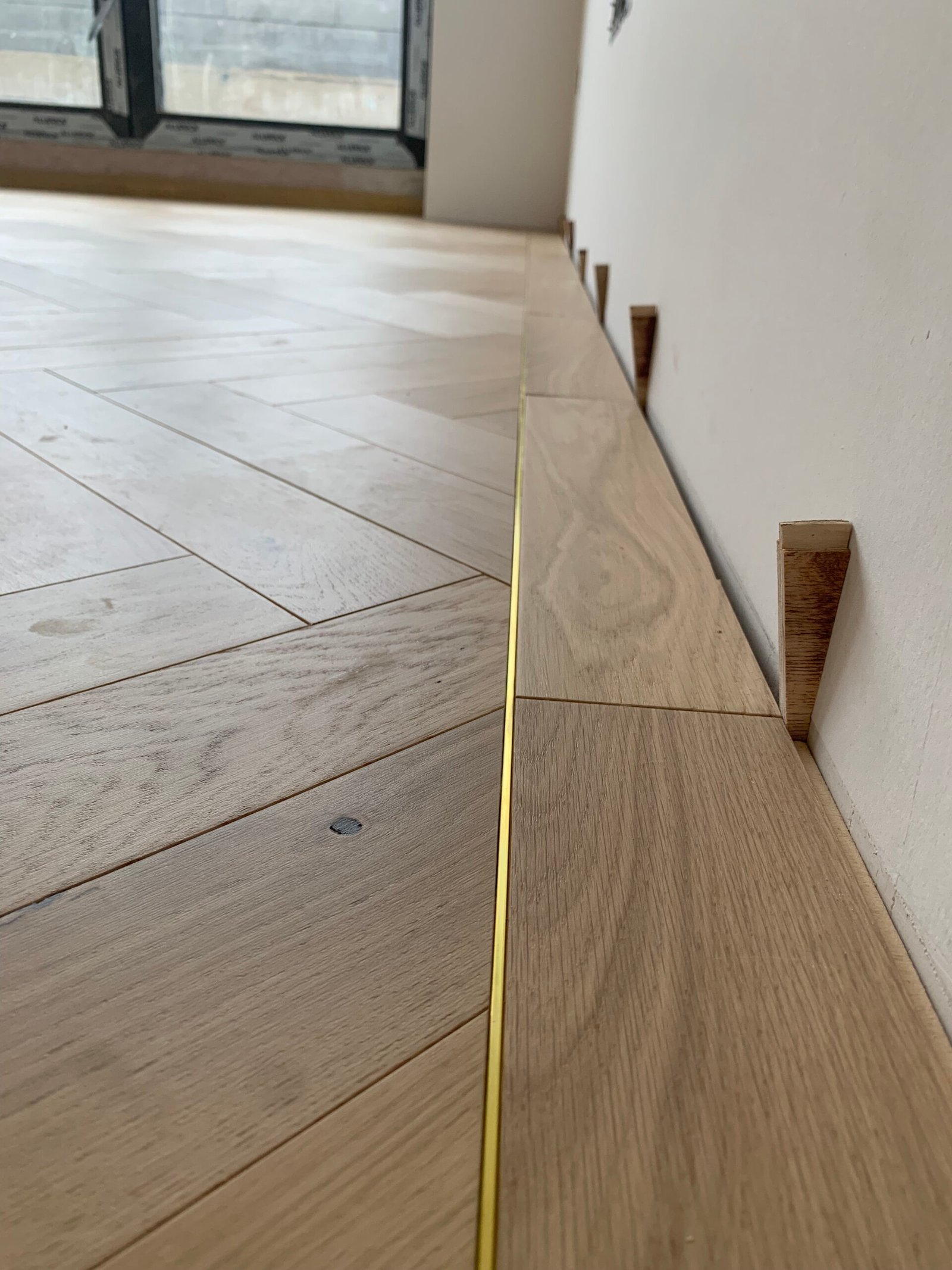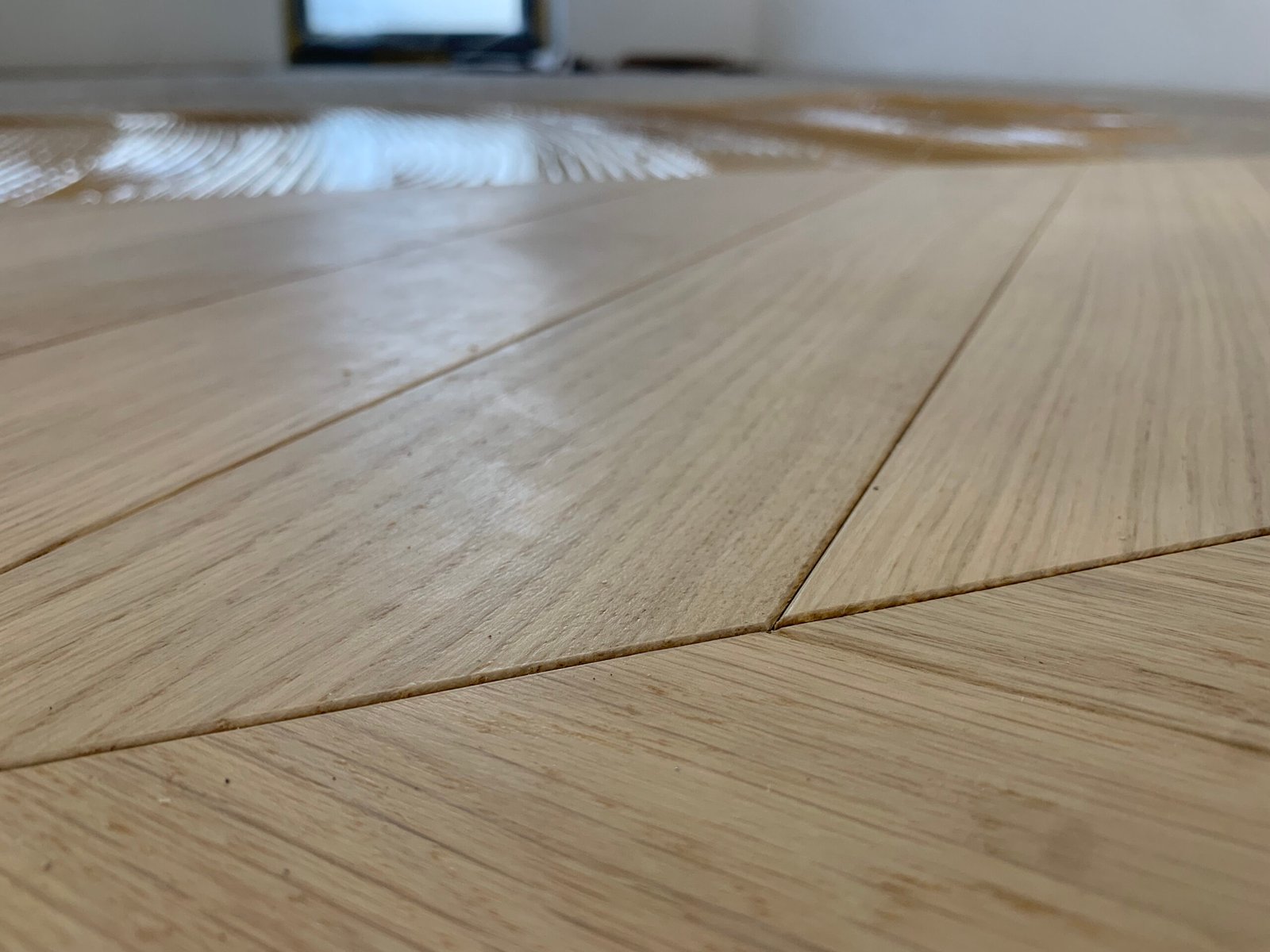 Pose d’un parquet en chêne sur notre support en OSB posé sur lambourdes, collé brut